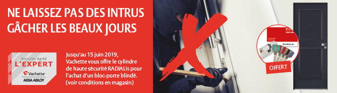 Jusqu’au 15 juin 2019, MS Protection votre serrurier agréé l'Expert Vachette à Toulouse vous offre le cylindre de haute sécurité RADIALis pour l’achat d’un bloc-porte blindé Vachette.